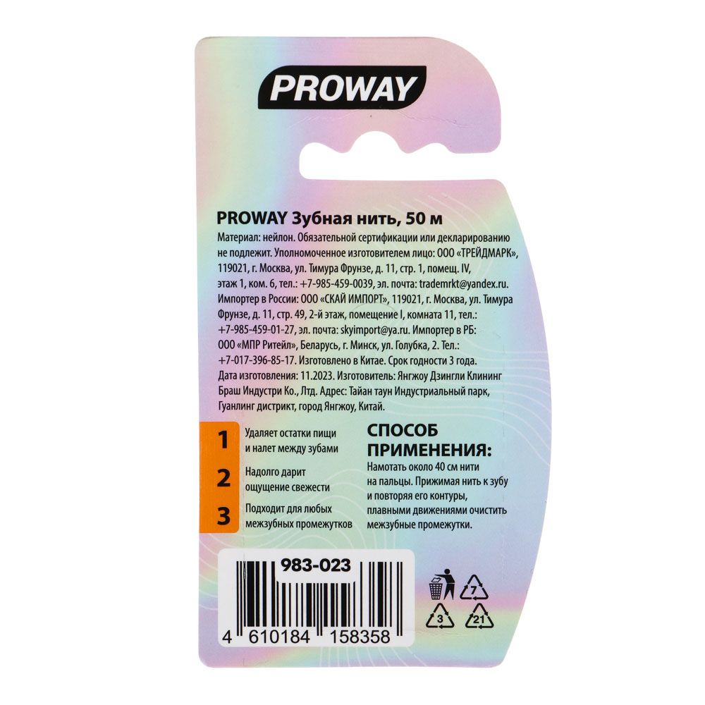 Познакомьтесь с инновационным решением для идеальной гигиены полости рта - зубной нитью PROWAY. С этой нитью ваш уход за зубами станет еще более эффективным и удобным. Специально разработанная для удаления зубного налета и остатков еды из промежутков между зубами, зубная нить PROWAY обеспечивает безупречную чистоту и свежесть ваших зубов и десен. Прочная и устойчивая, она позволяет осуществлять глубокую очистку даже в труднодоступных местах. Удобная упаковка содержит 50 метров зубной нити, обеспечивая вам достаточно запаса на продолжительное время. Незаменимый инструмент в вашем арсенале ухода за зубами, зубная нить PROWAY помогает сохранить вашу улыбку здоровой и привлекательной каждый день.