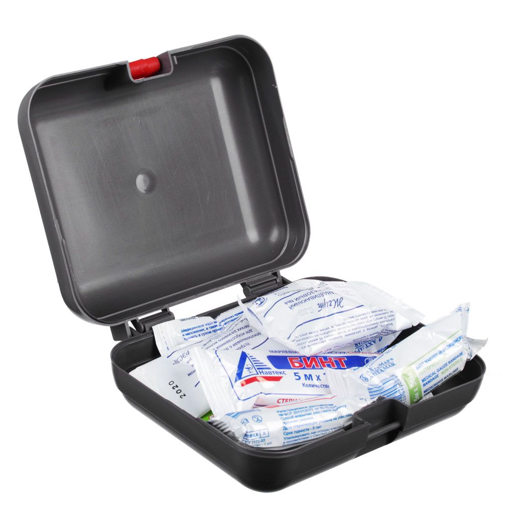 Бинт нестерильный 5х5 2 шт., Бинт нестерильный 5х7 1 шт., Бинт стерильный 5х10 1 шт., Бинт стерильный 5х5 1 шт., Жгут кровоостанавливающий 1 шт., Лейкопластырь 1х250 1 шт., Лейкопластырь бактериц.