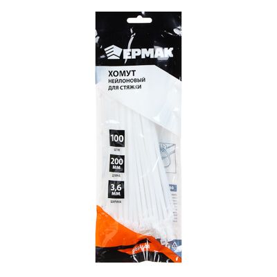 ЕРМАК Хомут нейлоновый для стяжки 3,6х200мм, белый 100шт/уп