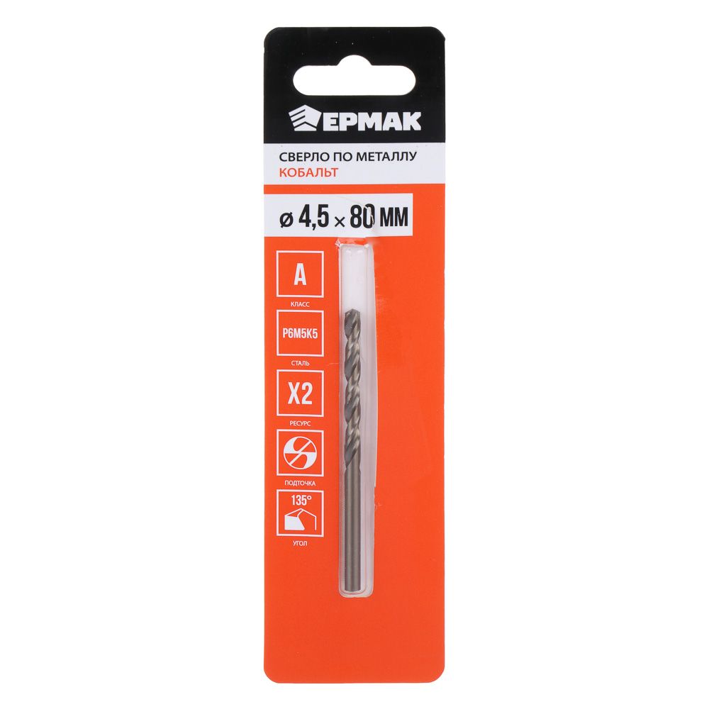 ЕРМАК КОБАЛЬТ Сверло по металлу 4.5х80мм, сталь Р6М5К5, класс А