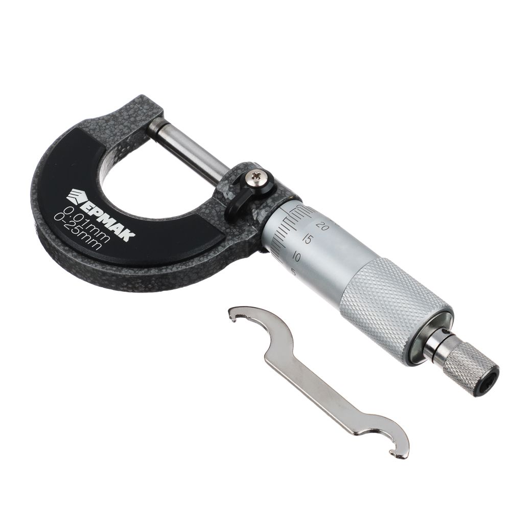 Механический микрометр ЕРМАК предназначен для высокоточных измерений в диапазоне от 0 до 25 мм. Незаменим для установления размеров мелких предметов и деталей. Шаг измерения – 0,01 мм. Удобен в использовании и имеет форму скобы, оптимальную для осуществления большинства измерений. Выполнен из высококачественной инструментальной стали, что обеспечивает длительный срок службы. Комплект включает жесткий пластиковый кейс для хранения.