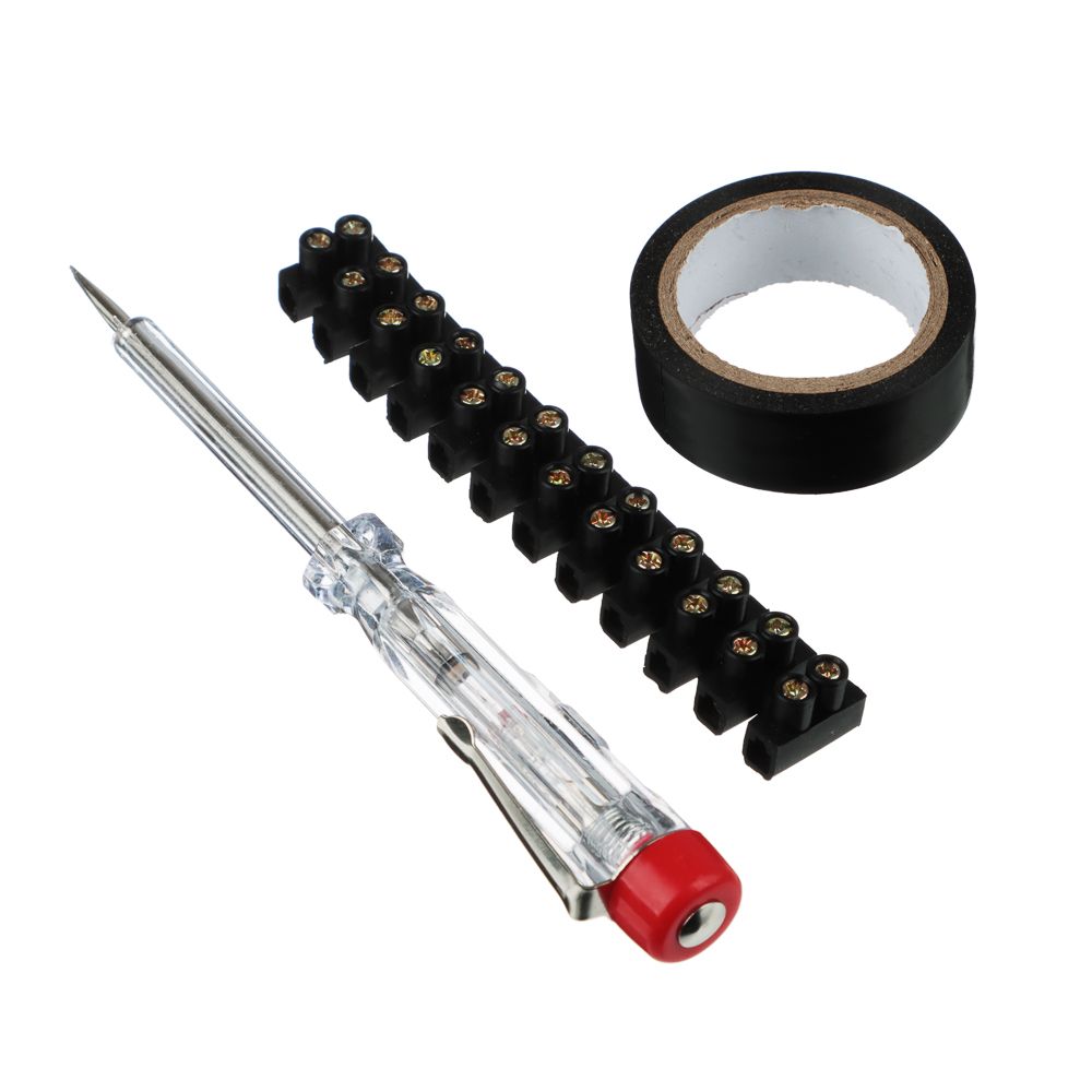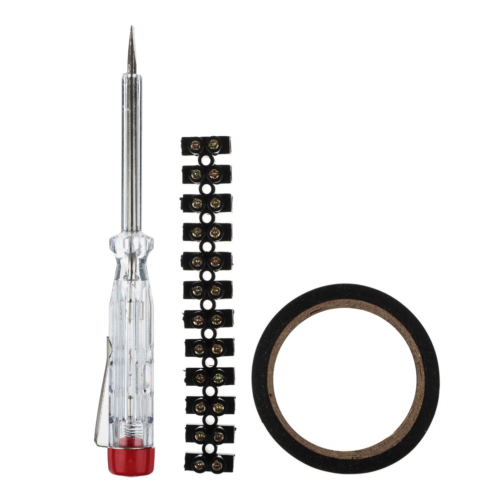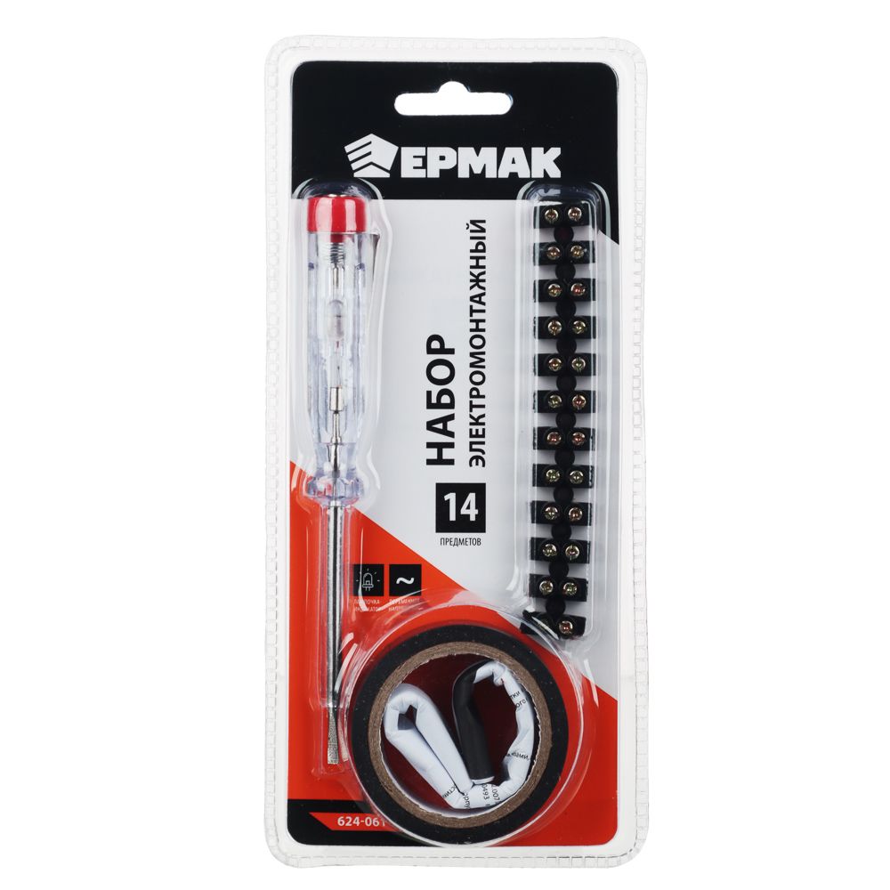 Электромонтажный набор ЕРМАК из 14 предметов включает индикаторную отвертку, клеммную винтовую колодку и изоленту. Отвертка со световой индикацией поможет проверить наличие напряжения в сети и позволит определить фазу и ноль во время монтажа электрической системы. Клеммное соединение поможет соединить и упорядочить провода и обеспечит надежную изоляцию. Изолента используется для обмотки оголенных проводов с целью их изоляции и обеспечения электробезопасности.