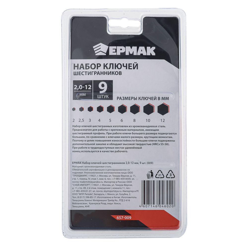 ЕРМАК Набор ключей - шестигранников 2,0-12мм, 9шт. (009)