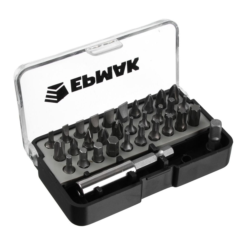 Набор отвертка-адаптер с битами ЕРМАК в стильном компактном кейсе из АБС-пластика состоит из 32 предметов, включая отвертку, адаптер и 30 бит разных типоразмеров: Torx, прямой, шестигранный, крестообразный шлиц. Все элементы выполнены из высококачественной прочной стали, обладают высокой степенью износостойкости и устойчивостью к деформации. Набор пригодится как домашнему мастеру, так и профессионалу. Может использоваться для бытовых работ по ремонту и монтажу, а также понадобится в автомобиле, мастерской или в гараже.Состав набора: Прямой шлиц: SL3, SL4, SL5, SL5.5, SL6, SL7; Крестовой шлиц: PH0, PH1, PH2, PH2, PH3; Шестигранный шлиц: H2, H3, H4, H5, H6; Шлиц TORX: T10, T15, T20, T25, T30, T40; Квадратный шлиц: S0, S1, S2, S3; Шлиц POZI: PZ0, PZ1, PZ2, PZ3; Магнитный держатель для бит 60 мм - 1 шт.; Адаптер - 1 шт.