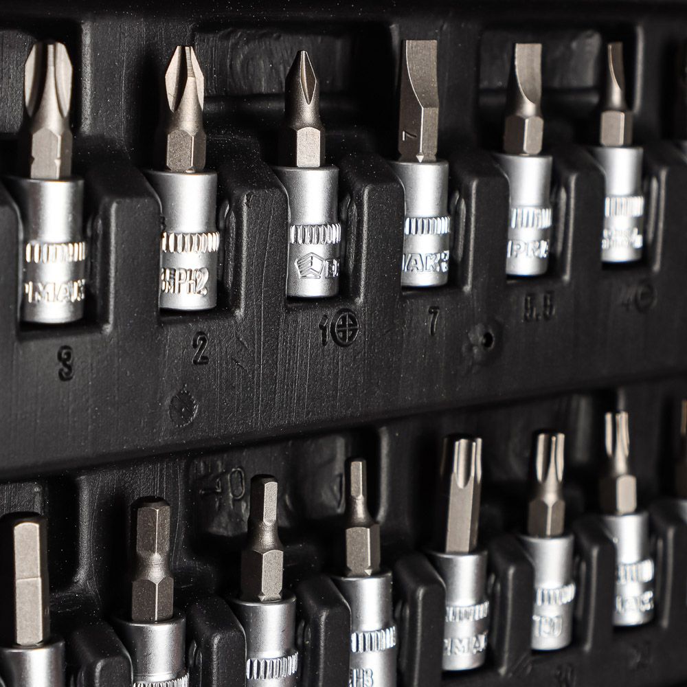 Торцевые головки 6-гранные 1/4" (13 шт.): 4-4.5-5-5.5-6-7-8-9-10-11-12-13-14 мм, Биты 1/4" (21 шт.): Т10-Т15-Т20-Т25-Т30-Т40, РН1-РН2-РН3, РZ1-РZ2-РZ3, H3-H4-H5-H6-H7-H8, SL4-SL5.5-SL7, Ключи шестигра