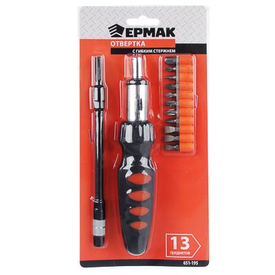 Отвертка Ермак с гибким стержнем. Ее используют, когда нужно добраться до крепления под углом и в труднодоступных местах. В комплекте 10 бит разного типоразмера: для крепежей с крестовым шлицем PH1, PH2, PH3, для крепежей с прямым шлицем SL5, SL6, SL7, для крепежей со шлицем с дополнительными насечками PZ1, PZ2, для крепежей со шлицем TORX T15, T20. Магнитный держатель для бит. Адаптер 1/4.Состав набора: т-образная отвертка с прорезиненной ручкой; прямой шлиц: SL3, SL4, SL5, SL6, SL8; крестовой шлиц: PH1, PH2, PH3; шлиц POZI: PZ1, PZ2, PZ3.