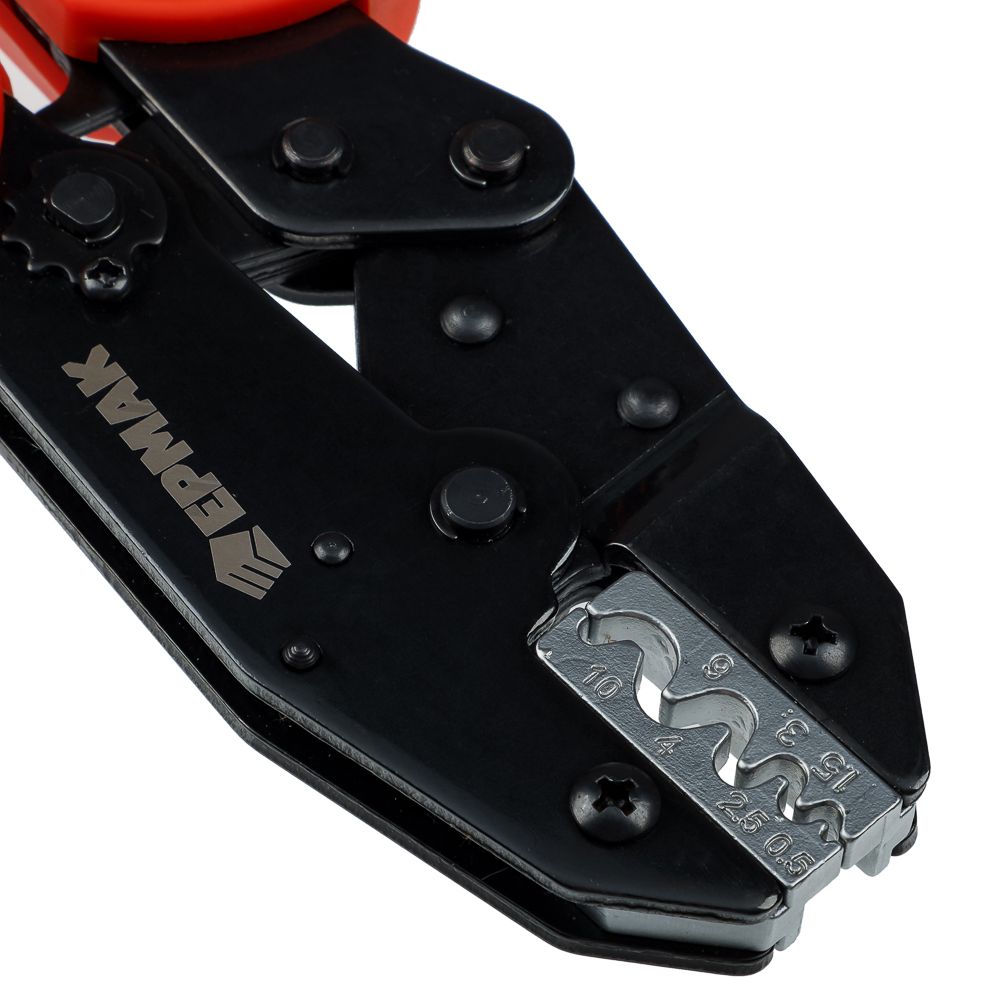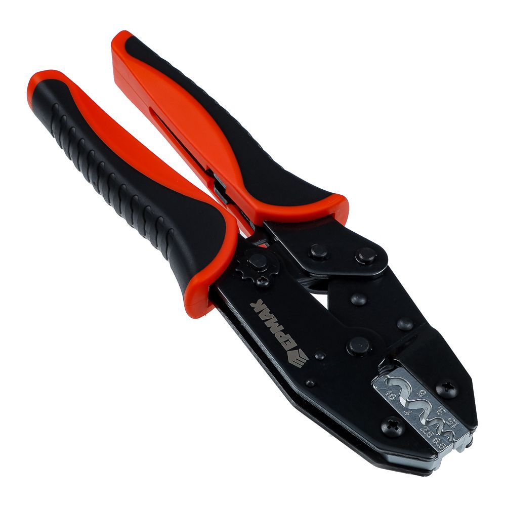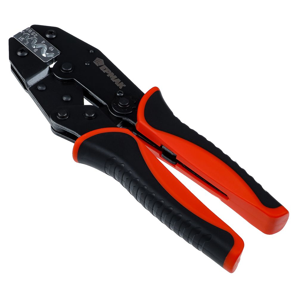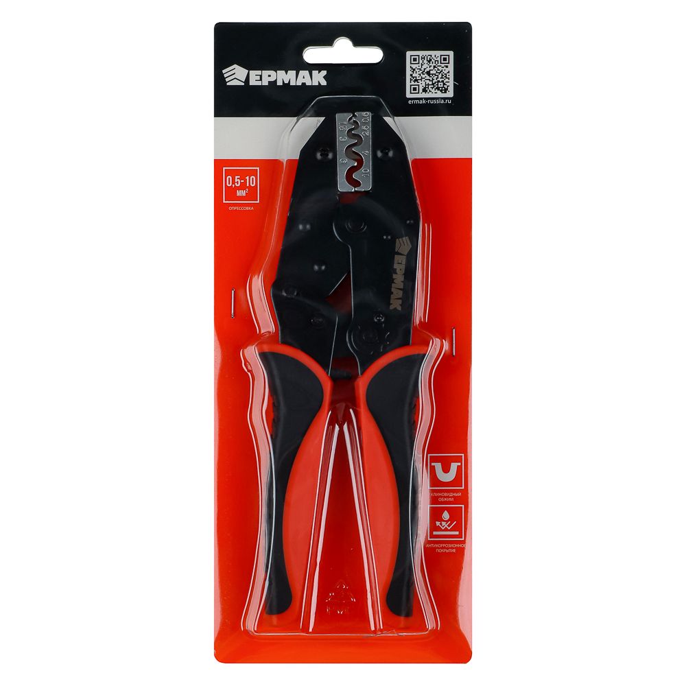 Обжимные пресс-клещи ЕРМАК предназначены для профессионального использования для обжима кабельных неизолированных наконечников и гильз. Тип обжима – клиновидный. Рычажная конструкция обеспечивает удобство в процессе обжима одной рукой. Храповый механизм для полного цикла опрессования. Предусмотрен регулятор прижимного усилия матриц. Возвратная пружина увеличивает скорость работы. Двухкомпонентная рукоятка с антискользящими накладками обеспечивает комфортный хват. Диапазон сечения – 0,5-10 мм2. Сталь с антикоррозийным покрытием значительно продлевает срок службы инструмента.