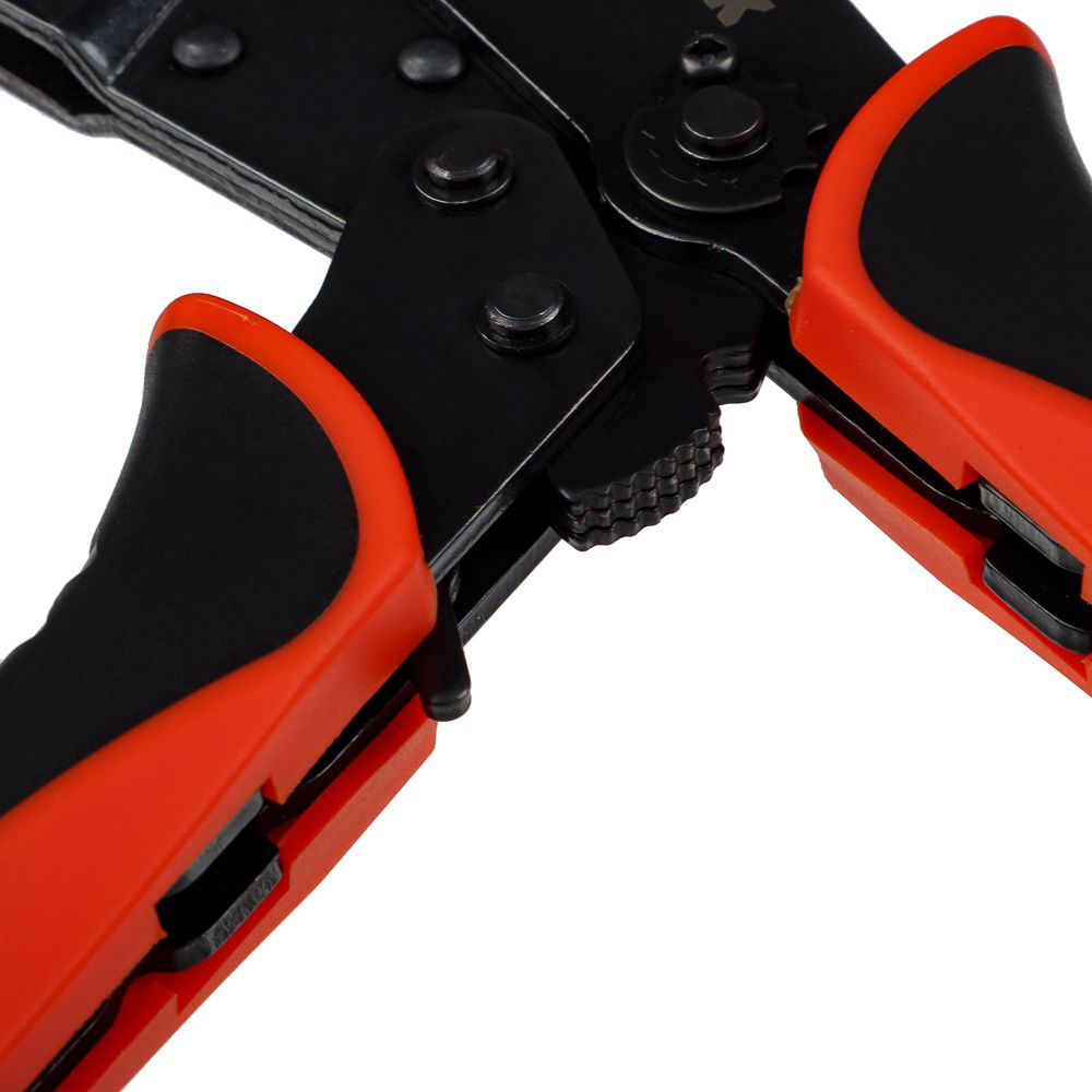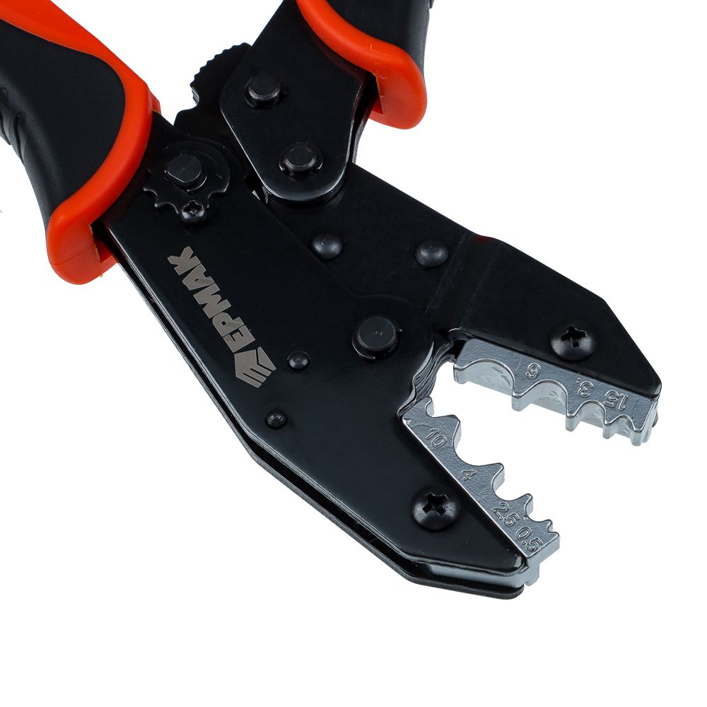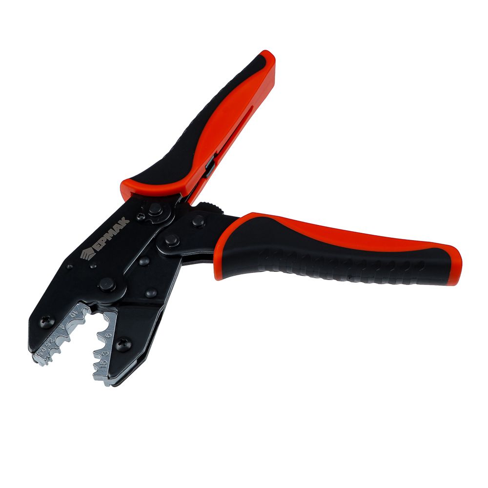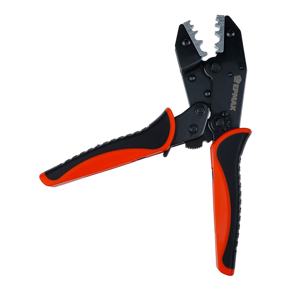 Обжимные пресс-клещи ЕРМАК предназначены для профессионального использования для обжима кабельных неизолированных наконечников и гильз. Тип обжима – клиновидный. Рычажная конструкция обеспечивает удобство в процессе обжима одной рукой. Храповый механизм для полного цикла опрессования. Предусмотрен регулятор прижимного усилия матриц. Возвратная пружина увеличивает скорость работы. Двухкомпонентная рукоятка с антискользящими накладками обеспечивает комфортный хват. Диапазон сечения – 0,5-10 мм2. Сталь с антикоррозийным покрытием значительно продлевает срок службы инструмента.