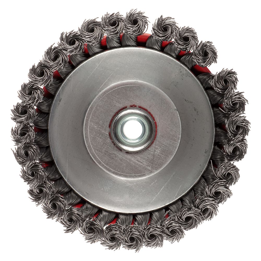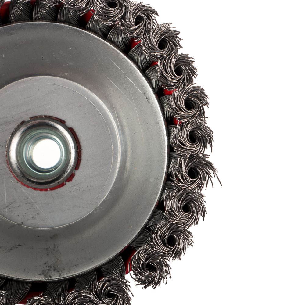 Изготовлена из стальной крученой проволоки. Такая щетка имеет высокую износостойкость и применяется при грубых зачистных работах по металлическим поверхностям, удалении окалины, ржавчины и заусенцев, сглаживании сварных швов.