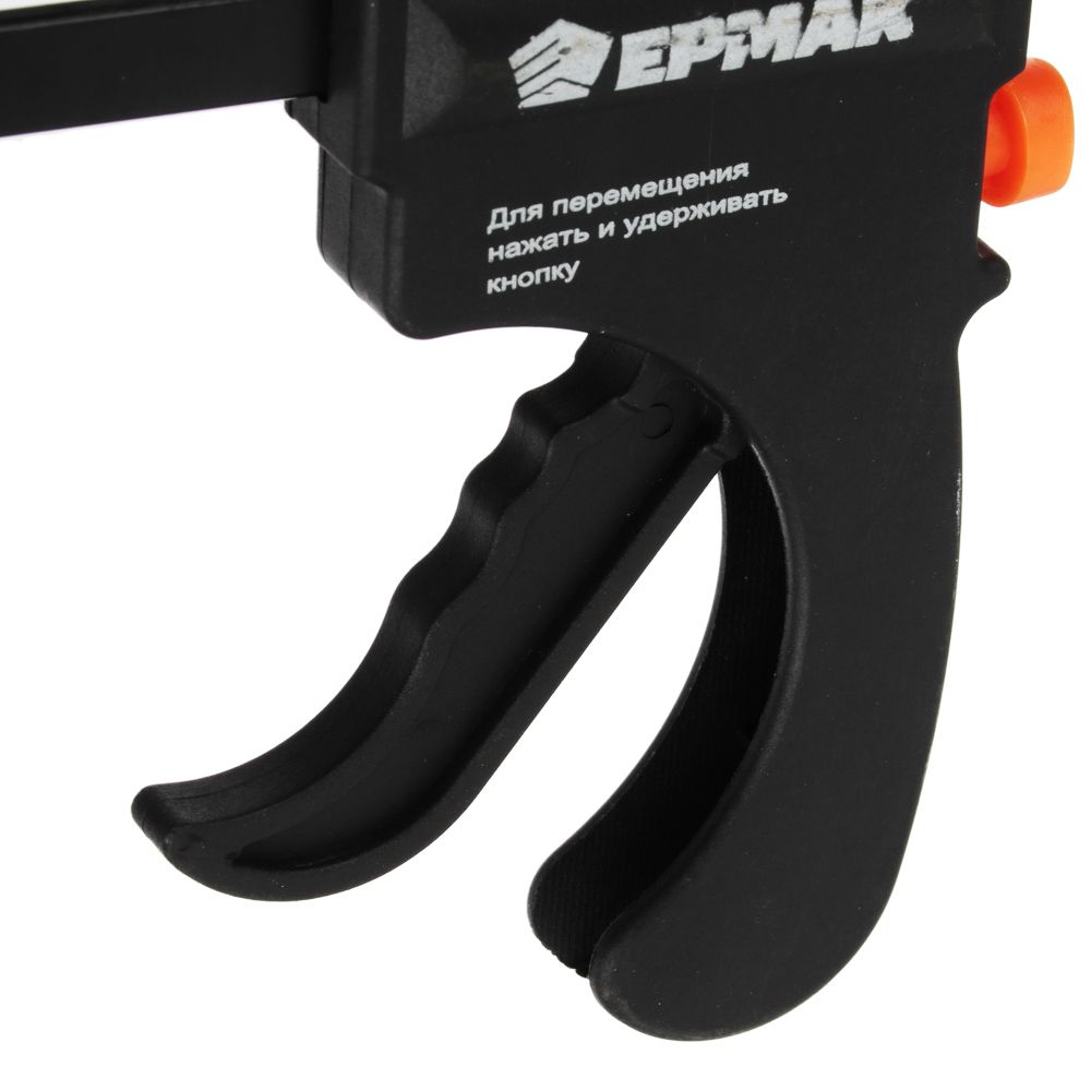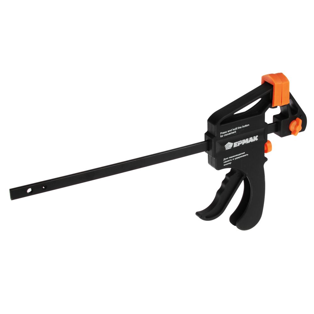 Универсальная F-образная быстрозажимная струбцина ЕРМАК, 150 х 265 х 45 мм, в пластиковом корпусе, используется в столярном деле. Позволяет быстро фиксировать заготовки с целью их соединения или обработки — склеивания, сверления, шлифовки, пиления и других видов работ. Подвижная губка перемещается вдоль штанги при помощи пластинчатого механизма, а фиксатор препятствует разжиманию струбцины. Компактный размер упрощает работу с инструментом. Преимущества: Направляющая изготовлена из стали и устойчива к нагрузкам, поэтому выдерживает значительные усилия при сжатии предметов. Рабочие элементы выполнены из ударопрочного пластика и обладают высокой механической стойкостью, что увеличивает срок службы инструмента. Защитные накладки на губках предохраняют зажимаемые детали от повреждений. Опорную губку можно установить на противоположный конец штанги, после чего использовать струбцину на разжим.