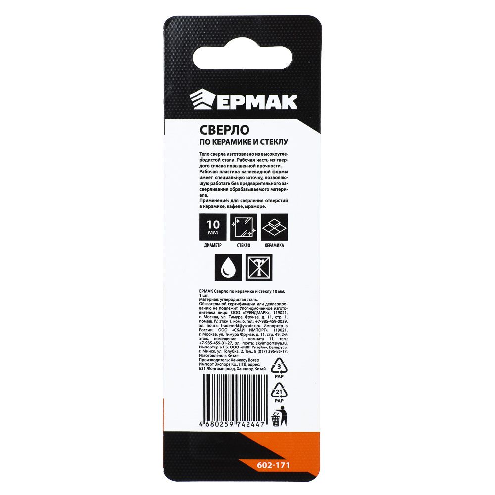 ЕРМАК Сверло по керамике и стеклу 10мм, 1 шт.