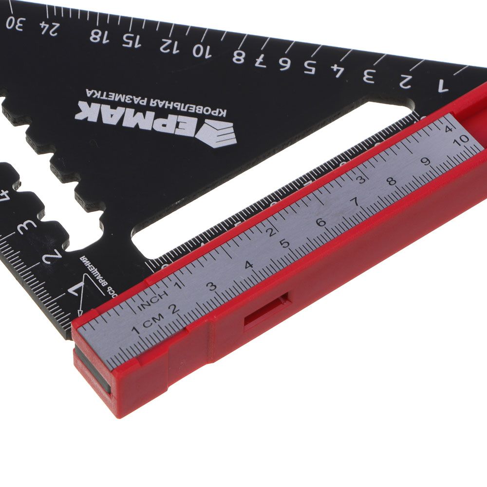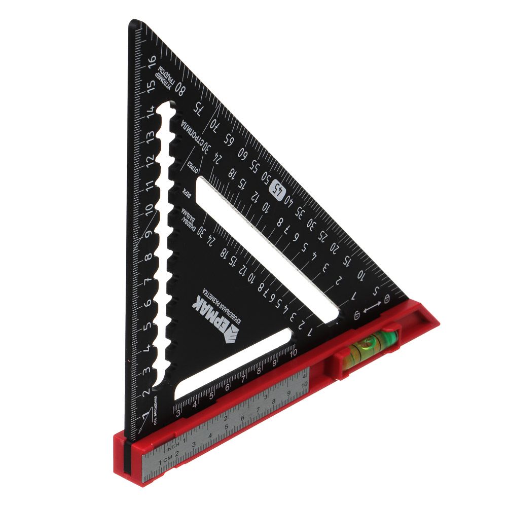 Кровельный угольник ЕРМАК с уровнем 190x190 мм – это незаменимый инструмент для проведения строительных, кровельных и столярных работ. Выполняет целый ряд полезных функций и содержит в себе транспортир для измерения углов, ось вращения выполняющую функцию циркуля, шкалу разметки наклонных стропил, а также рейсмус, обычную линейку и строительный пузырьковый уровень. Угольник изготовлен из алюминия. Устойчив к коррозии и деформации. Шкала разметки четкая, не стирается с течением времени.