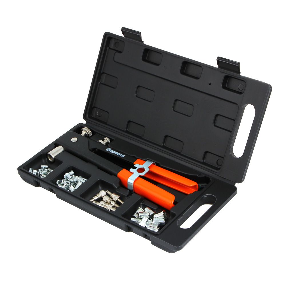 Заклепочник, Насадки М3 1 шт., М4 1 шт., М5 1 шт., М6 1 шт., М8 1 шт., Резьбовые заклепки М3 10 шт., М4 10 шт., М5 10шт., М6 10 шт., М8 10 шт., Кейс