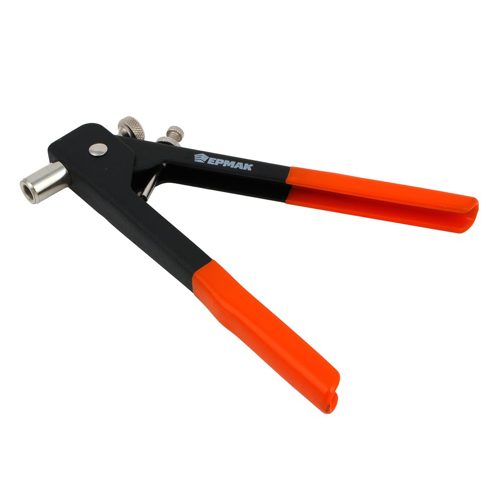 Заклепочник для резьбовых заклепок ЕРМАК двуручный служит для быстрого и удобного скрепления между собой различных материалов при помощи заклепок с резьбой. • Заклепочник изготовлен из качественных материалов, поэтому отличается высокой прочностью и устойчивостью к износу.• Рукоятки не скользят в ладонях.• Инструмент подходит для стальных и алюминиевых заклепок.