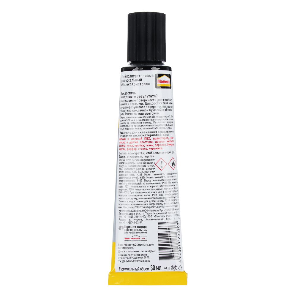 Клей «Момент кристалл» — надежное решение для бытовых задач и ремонта. Средство идеально подходит для склеивания в различном сочетании таких материалов, как: мягкий и жесткий ПВХ, полистирол, оргстекло и другие виды пластика, дерево, металл, резина, кожа, пробка, ткань, поролон, бумага, картон, фарфор, стекло, керамика. Водо- и морозостойкий состав имеет прозрачный цвет, в тюбике содержится 30 мл клея.