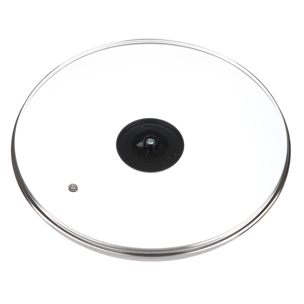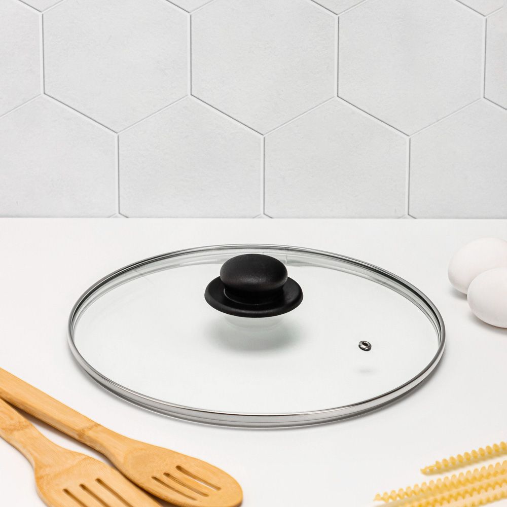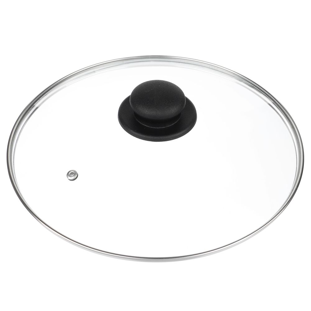 Жаропрочная крышка диаметром 28 см из термостойкого стекла с ободком из высококачественного металла и не нагревающейся ручкой подходит для кастрюль и сотейников. Металлический ободок препятствует образованию сколов, а ручка не скользит в руке и не нагревается во время приготовления. Прозрачная крышка позволяет полностью контролировать процесс приготовления без потери тепла. Крышка оснащена отверстием для выхода лишнего пара. Перед первым использованием крышки стеклянной: - Удалите имеющиеся стикеры и наклейки;- Вымойте в теплой воде жидким моющим средством для посуды мягкой губкой. Тщательно сполосните и вытрите насухо;- При мытье в посудомоечной машине рекомендуется вынуть ее сразу после завершения процесса мытья, чтобы исключить возможность появления пятен кондиционной влаги.