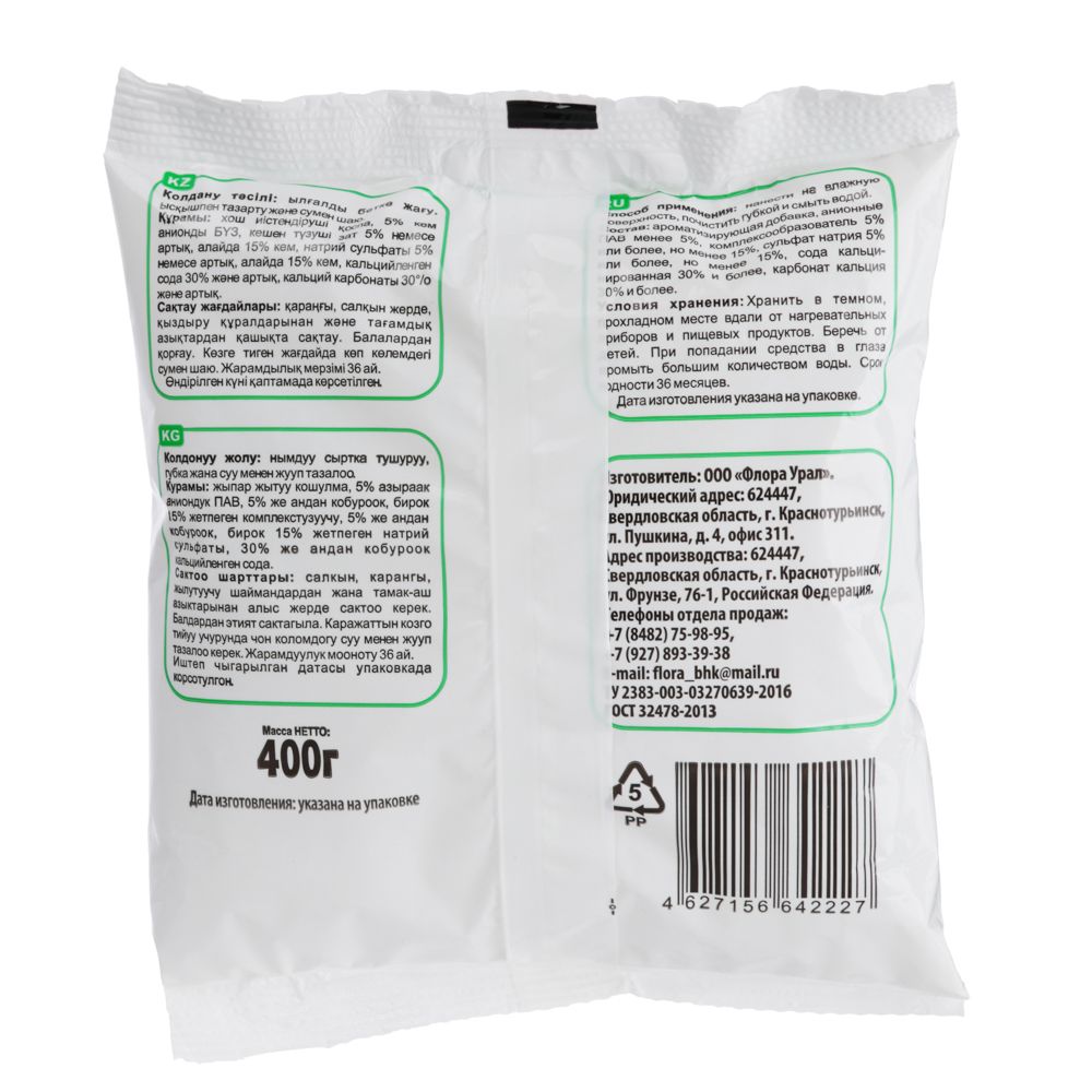 Чистящий порошок ФЛОРА «Мой» универсальный может применяться на кухне, в ванной и в туалете для чистки сантехники, газовых и электрических плит, рабочих поверхностей, утвари, хромированных смесителей и кафельной плитки. Придает блеск обработанным зонам, не царапает и не разъедает поверхности. Эффективно уничтожает бактерии и неприятные запахи. Экономично расходуется. Масса пакета – 400 г.