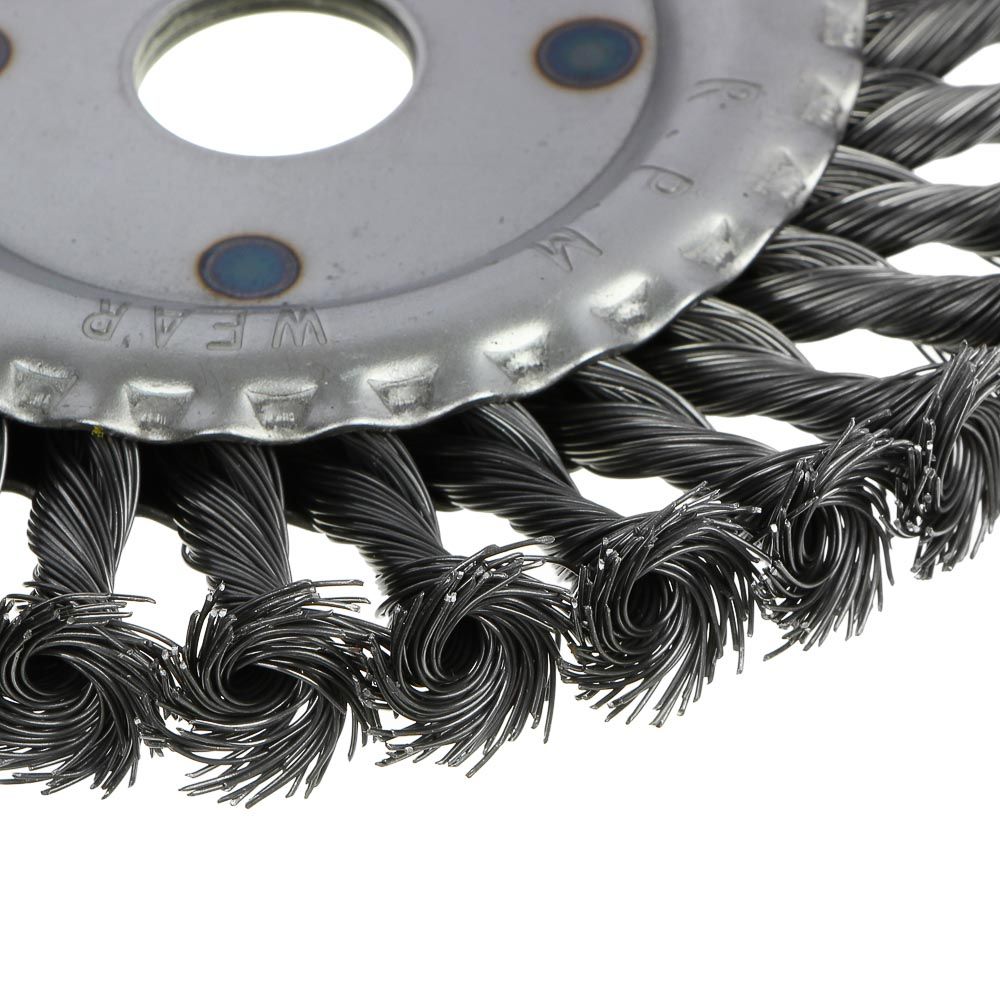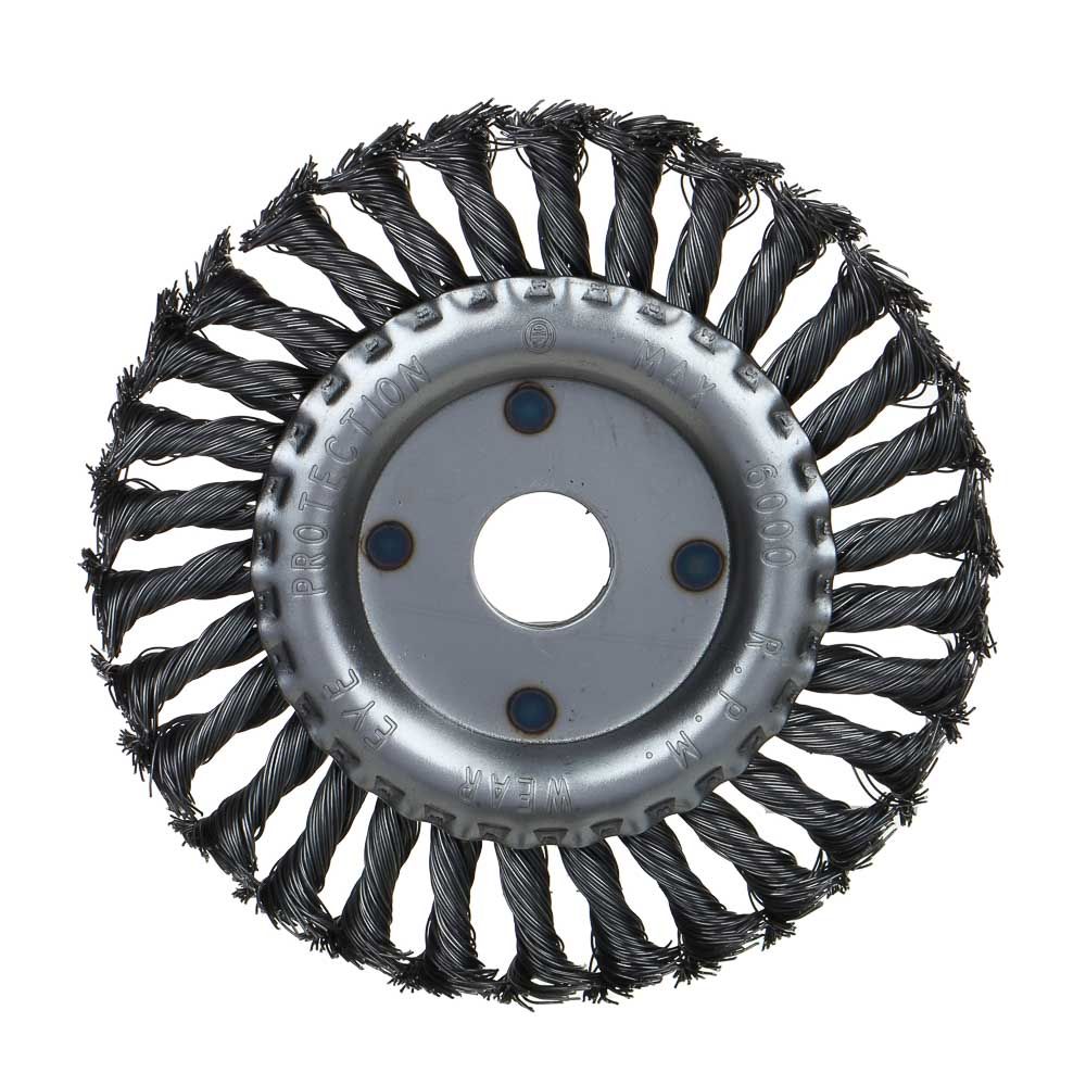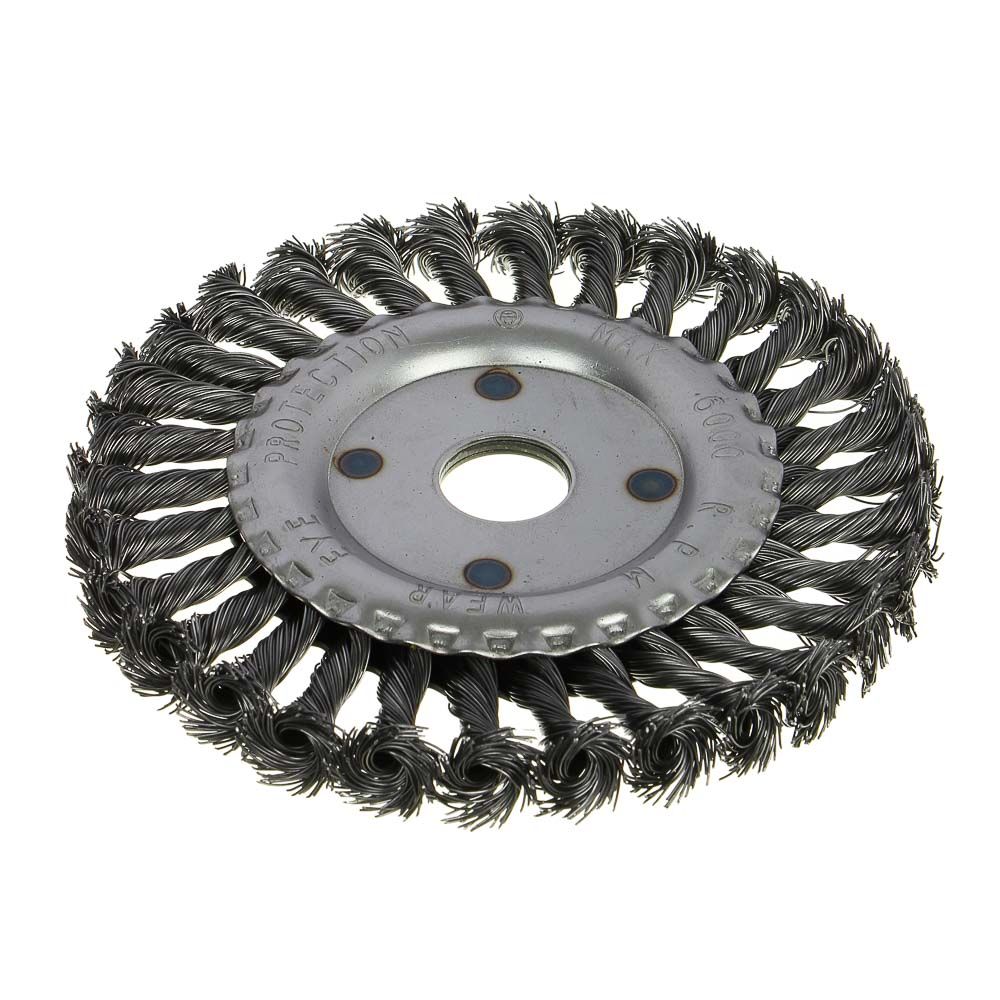 Щетка дисковая металлическая крученая РОКОТ для УШМ 150 мм/22 мм – это насадка для угловой шлифовальной машины, которая используется для проведения грубых шлифовальных работ. Эффективно очищает металлические поверхности от ржавчины, грязи, старого лакокрасочного покрытия для подготовки под покраску, а также для зачистки сварных швов. Плоская форма позволяет вести обработку в углах и других труднодоступных местах. Стальная проволока не подвержена износу, поэтому щетка будет служить долго.